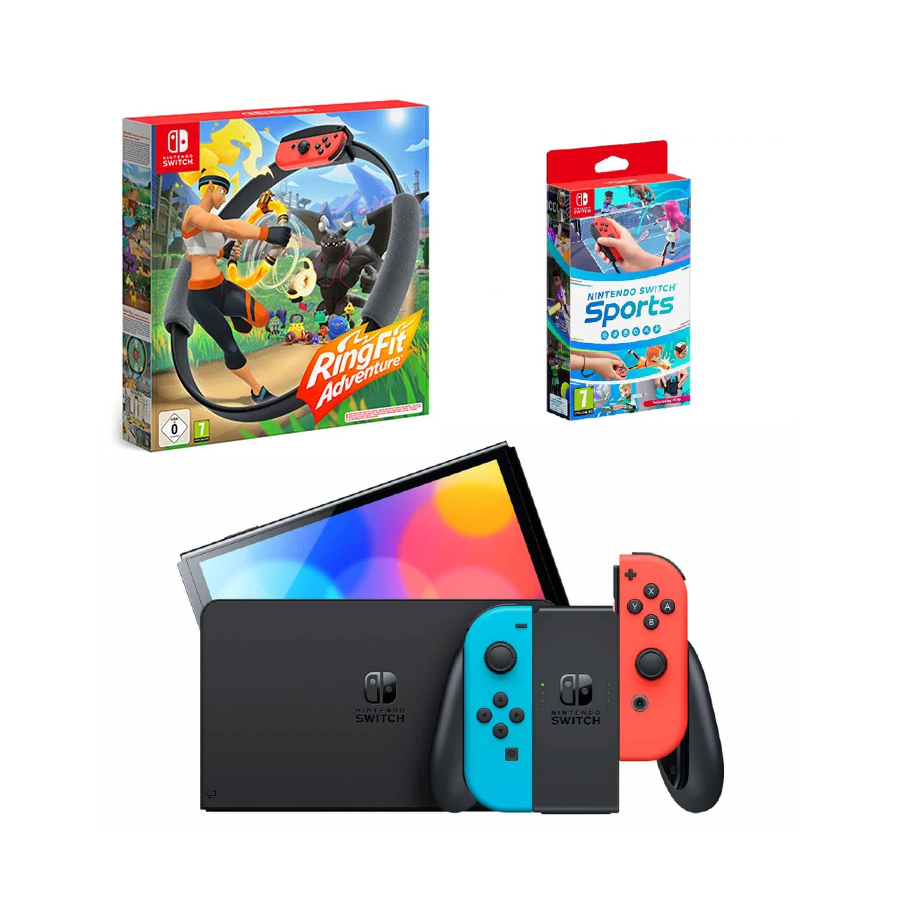באנדל Nintendo Switch דגם OLED + Nintendo Switch Sports + Ring Fit Adventure