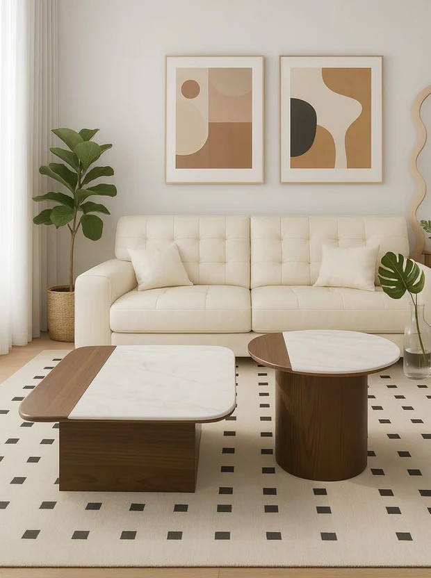 סט 2 שולחנות סלון עשויים עץ בשילוב פלטת שיש בצבע לבן